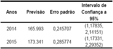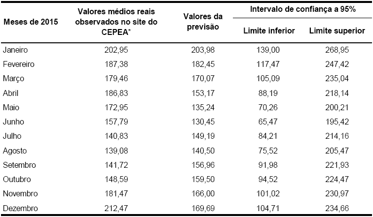 De acordo com dados divulgados no site do Canal Rural (2015), os valores chegaram em meados de junho a R$ 142,93. Esse valor ficou próximo ao obtido por meio da análise que previu um valor médio para o mês de R$ 130,45 e ficou dentro dos limites de confiança de R$ 65,47 e R$ 195,42. Estes, juntamente com os valores médios dos primeiros meses de 2015, confirmaram a eficiência da previsão realizada pelo método escolhido, sendo importantes para validação do modelo. Chavez (1997), explica que as previsões não têm o intuito de serem exclusivas ou permanentes e que estas precisam ser revisadas e até mesmo alteradas ao longo do tempo, pois informações disponibilizadas devem ir sendo acrescentadas sempre que possível, afirma ainda que a previsão é uma ferramenta importante, mas exige uma análise criteriosa.