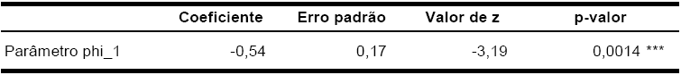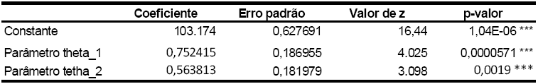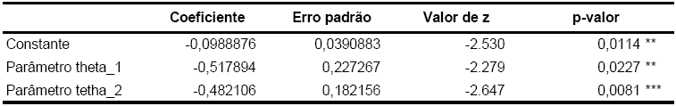 Verificou-se o comportamento não estacionário da série por meio do teste de Raiz Unitária de Dickey-Fuller Aumentado, onde p > 0,05. Portanto, para realização da previsão por meio dos modelos de Box-Jenkins foi necessária uma diferenciação, a qual se mostrou suficiente para tornar os dados estacionários. Posteriormente escolheu-se como mais adequado um modelo ARIMA (0,1,2), com o qual foram obtidos os resultados apresentados no Quadro Nº 4.