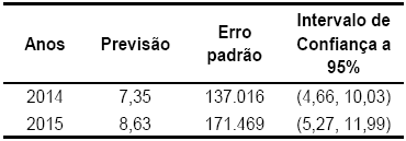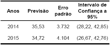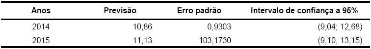 Os dados reais apresentados pelo IBGE (2017) indicam os valores de 9,52% para o ano de 2014 e 9,64% para 2015, para o Maranhão. Os dois métodos de previsão estudados apresentaram resultados satisfatórios, sendo que os valores reais se aproximaram dos previstos e ficaram dentro dos intervalos de confiança fornecidos.