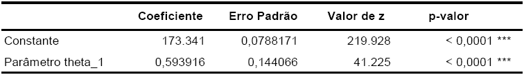 Realizando-se a previsão por meio dos modelos de Box-Jenkins escolheu-se como mais adequado um modelo ARIMA (0,0,1), sendo que para tal obteve-se os resultados apresentados no Quadro Nº 8.