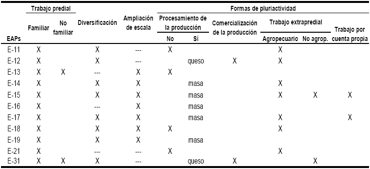 Los casos analizados en el marco de la presente investigación muestran la combinación de al menos dos o más actividades en la mayoría de las unidades de producción que pueden involucrar a uno o más miembros del grupo familiar. De este modo la actividad láctea es acompañada por alguna de las siguientes actividades: i) procesamiento de la leche en el predio para la elaboración de subproductos lácteos, en general masa para mozzarella; ii) trabajo extrapredial como peones o cuidadores en campos vecinos (con diferentes tipos de arreglos) o a destajo (changas diarias); iii) trabajo por cuenta propia como contratistas de labores o transportistas; y, iv) trabajos fuera del sector agropecuario en empleos públicos.