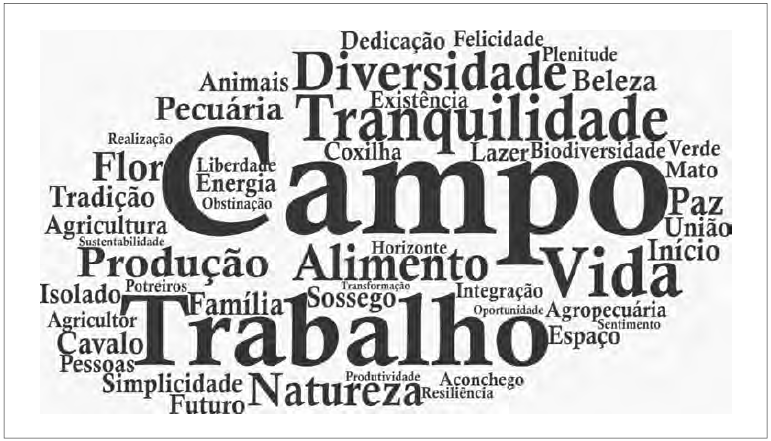 Na realização da pesquisa buscou-se examinar a concepção de rural dos discentes a partir de múltiplos pontos de vista e de instrumentos de informação. Além dos questionários aplicados, das fotografias que cada um deles realizou sobre a imagem, cena ou objeto que lhe parecia mais representativo, do exame da defesa ou argumentação dessa escolha e das narrativas construídas a partir das questões propostas, estabeleceu-se, também um outro ponto de observação e de análise da questão. Assim, na sessão em que as fotos foram apresentadas e onde se deu a exposição das razões que guiaram a escolha da imagem representativa, pediu-se aos estudantes que elegessem uma palavra ou expressão que, no seu entendimento, pudesse sintetizar a respectiva ideia de rural. Na realização dessa dinâmica insistiu-se no fato de que não se tratava de saber o que era certo ou errado. Eleger livremente a palavra era parte de um exercício que expunha um sistema de preferências, uma opinião pessoal e a influência da trajetória pessoal de cada um dos participantes.