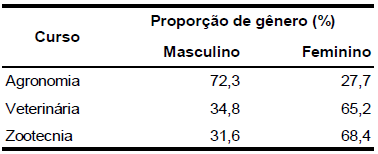 O conjunto de alunos se acha rigorosamente dividido entre os gêneros feminino (50%) e masculino (50%). Mas quando se analisa os cursos separadamente (Quadro Nª 3) há diferenças dignas de nota. O curso de Zootecnia é o que apresenta a maior proporção de mulheres (68,4%), seguido de perto pela Veterinária (65,2%). Já na Agronomia a participação de mulheres é consideravelmente mais baixa (27,7%). A presença feminina em espaços até bem pouco tempo dominados pelos homens reveste importância, tratando-se de fenômeno que desvela uma revolução silenciosa operada no país e no mundo, de uma forma geral, nas quatro últimas décadas.