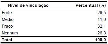 Com base nestes critérios, a vinculação com o rural foi mensurada segundo quatro níveis ou escalas (forte, médio, fraca e nenhum vínculo). No primeiro caso, trata-se de jovens cujos pais vivem da agricultura ou são agricultores e/ou criadores, os quais residem no meio rural ou no próprio estabelecimento. Já no caso do nível médio tais critérios são atendidos apenas parcialmente, enquanto no nível fraco esse atendimento é mínimo. No último nível (nenhum vínculo) os alunos