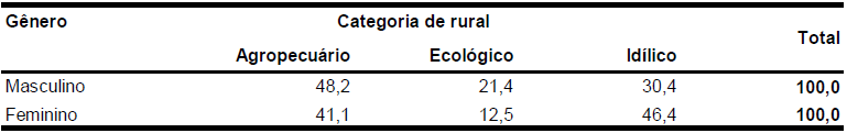 A primeira delas é o que se pode denominar como o «rural agropecuário», refletindo escolhas que remetem ao âmbito da produção e do trabalho agrícola. A segunda concepção remete ao que se considera como o «rural idílico». Nesse caso, têm-se as associações feitas ao rural como lugar da memória, em boa medida ligado a uma conexão de caráter sentimental ou afetivo com esse espaço. A terceira concepção compreende o rural «ecológico ou ambiental», pressupondo uma concepção mais ligada ao lugar da natureza e da biodiversidade, das plantas e dos animais silvestres. Os dados do Quadro Nª 6 mostram a distribuição das respostas segundo as três categorias aqui elencadas. Como é possível perceber, o rural agropecuário (44,6%) prepondera sobre o rural idílico (38,4%) e sobre o rural ecológico ou ambiental (17,0%).Todavia, os dados do Quadro Nª 7 parecem supor que a concepção de rural agropecuário prepondera entre os rapazes (48,2%) em relação às moças (41,1%).Não obstante, a acepção do rural idílico supera no caso das moças (46,4%) em relação aos rapazes (30,4%). Todavia, não há elementos que permitam extrair conclusões efetivas em relação a esse aspecto
