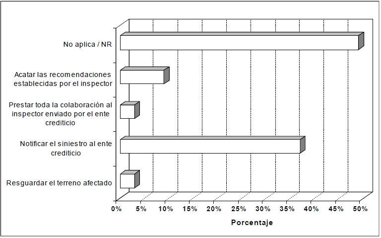 Durante el proceso de obtención de respuesta del SCA, cuando se presenta un siniestro (Gráfico Nª 9) 49% de los productores (20) carece de información sobre ello, mientras que 15 de los productores (37%) notifica el siniestro al ente crediticio como el primer paso, seguido por 9% (representado por 4 de los productores) quienes consideran relevante acatar las recomendaciones establecidas por el inspector. Sin embargo, los técnicos no asisten al productor según lo manifiestan. En igual proporción, 2,5% de los productores considera prestar la colaboración al inspector enviado por el ente crediticio, así como resguardar el terreno afectado.