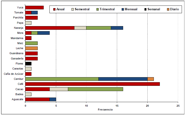 Entre los rubros de mayor producción (Gráfico Nª 1) en las explotaciones de los productores encuestados, destacan: el café, el banano (o cambur), la naranja y el cacao, con una frecuencia de 22, 21, 16 y 16 –respectivamente–, con un ciclo anual absoluto para el café; por su parte, el banano (o cambur) presenta variaciones entre diario, mensual y trimestral, siendo este último el de mayor prevalencia en su duración del ciclo. La naranja y el cacao presentan un ciclo de duración anual, semestral o trimestral. En el ciclo anual domina la naranja, mientras que en el ciclo trimestral predomina el cacao.