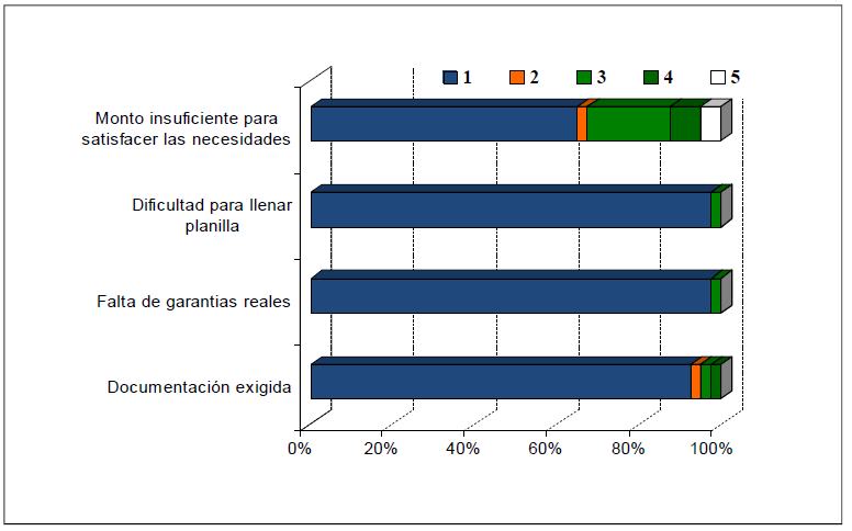 En relación con los niveles de dificultad resalta la insuficiencia del monto para satisfacer las necesidades de la actividad agrícola; para ello, se identifica con 1 la dificultad más baja y con 5, la más alta (Gráfico Nª 2). Los niveles más altos de dificultad se registraron con valores iguales a 4 y 5, en el caso de 3 productores agrícolas (7,5%), mientras que la dificultad para llenar la planilla, la falta de garantías reales y la documentación exigidas corresponden a los niveles más bajos de dificultad. Sin embargo, este último (documentación exigida) presenta un nivel de dificultad levemente alto (4) para cualquier productor agrícola.