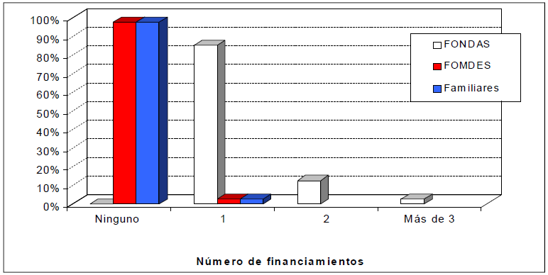 El número de financiamientos (Gráfico Nª 3) recibidos por los productores agrícolas en los últimos tres años del período analizado han sido otorgados principalmente por el FONDAS, con una mayor frecuencia en un único crédito (85%), frente a 12,5% de los productores que han recibido dos créditos y 2,5% recibió más de dos (2) créditos.