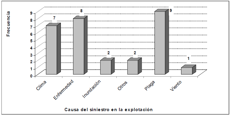 De los 40 productores que contestaron la pregunta sobre siniestros, 57,50% respondió que ha enfrentado algún tipo de siniestro con pérdidas significativas en su unidad de producción (UP), frente a 42,5% que no lo han padecido. En el Gráfico Nª 4 se observan los siniestros más frecuentes: plagas y enfermedades con una frecuencia de 9 productores (22,5%) y 8 (20,0%) respectivamente. Seguidamente, se encuentra el clima, para el cual se toman en cuenta las lluvias excesivas, ondas cálidas, granizo y heladas, con una frecuencia de 7 (17,5%) de los productores. Las inundaciones, el viento u otros siniestros son de menor incidencia con una frecuencia menor o igual a 2 (2,5%).