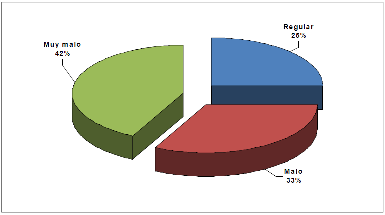 El seguimiento y asesoría por parte de los técnicos de la institución crediticia (Gráfico Nª 6) es considerado Muy malo por 38% de los encuestados, seguidos por una proporción de 29%, compartida para las modalidades Regular y Malo, mientras que 4% de los productores no respondió a esta interrogante.