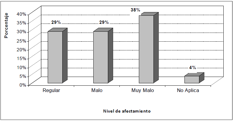 El nivel de afectación en la unidad de producción por el padecimiento de los siniestros (Gráfico Nª 5) ha sido Muy malo para los productores (43%), mientras que el nivel de afectación Malo representa 32% y el nivel intermedio Regular, 25%.