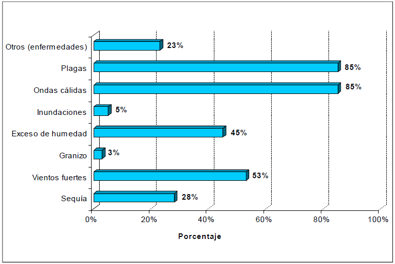 Las principales causas señaladas por los productores para la ocurrencia de los siniestros (Gráfico Nª 7) vienen dadas por condiciones de ondas cálidas y plagas, ambas con la misma proporción de 85% de los productores. Seguidamente se encuentran los fuertes vientos, con 53% y el exceso de humedad, con 45%; mientras que la sequía y las enfermedades representan el grupo de causas a un nivel porcentual más pequeño, con 28% y 23% respectivamente. Por su parte, las inundaciones y el granizo son las causas de siniestros de menor incidencia entre los productores, con 5% y 3%.