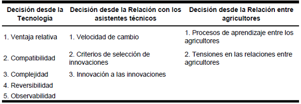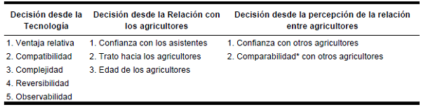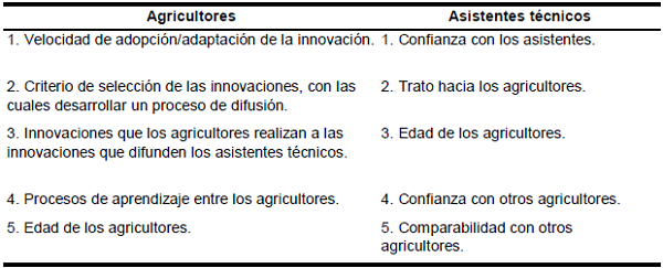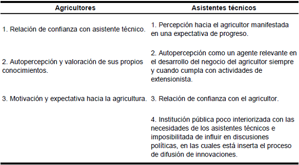 De manera transversal a los agricultores y los asistentes técnicos emergieron factores que influyen en el proceso de difusión de innovaciones. Estos se concentran en: a) factores referentes a la relación agricultor y asistente técnico; y, b) factores referentes a la relación entre agricultores. Los factores asociados a la decisión de la tecnología, se plantean desde la decisión desde un plano individual del actor que adopta, adapta o rechaza una tecnología, mientras que la relación entre asistentes técnicos-agricultores y entre agricultores, responde a un plano colectivo del proceso de difusión.