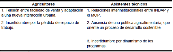 Las críticas a las políticas tecnológicas encuentran su expresión en la falta de comunicación en las relaciones interinstitucionales, lo que impide efectividad y priorización en políticas agroalimentarias. Desde la visión de los asistentes técnicos se plantean en términos de ausencia de políticas agroalimentarias que –por un lado– orienten de forma clara las políticas tecnológicas (tipo y utilidad de la tecnología, métodos de difusión); y que –por otro lado– permitan una respuesta desde INDAP, ante la imposición de los intereses de otras instituciones públicas por sobre las propias. Esto trae como consecuencia el interpretar al Ministerio de Obras Públicas (MOP) como una institución que expresa los intereses «de lo urbano» (a través de expropiaciones), mientras que INDAP expresa los intereses de «lo rural».