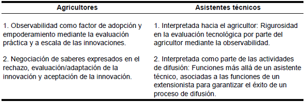 Respecto de la interacción entre asistentes técnicos y agricultores en los procesos de difusión de innovaciones, es posible proponer –en función de los hallazgos– un nuevo factor de adopción: «comparabilidad» de la experiencia, que puede complementar los cinco factores de adopción planteados por Rogers (1993), en este nuevo factor se evidencia que los agricultores tienden a preferir la «equidad» en la relación con los asistentes técnicos y los resultados que esto conlleva, por lo tanto si una acción de estos es interpretada como «favoritismo» puede afectar la relación con el conjunto de agricultores. En consecuencia, los agricultores no solo se preocupan de sus resultados individuales, si no que comparan sus resultados con los obtenidos por los demás.