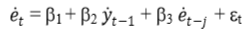 (3)where è. and y˙t represent rates of growth, Ln_Et and Ln_Yt stay for the logarithm of employment and output, and β2 is the estimated EE. Seyfried (2014) modifies equation (2) to consider the persistence of employment growth for several European countries during the period 1999-2012, using impulse-response analysis to determine the appropriate lag-structure based on the Akaike information criterion: