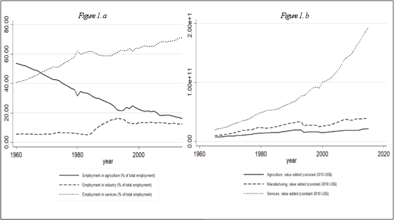 Dragging people out from low- productivity jobs to more productive sectors helped some Asian countries to substantially reduce poverty and become more competitive. In Colombia, the employment in agricultural sector shows a sharp reduction, accompanied by an increasing participation of the tertiary sector in the labor market, as well as a sustained growth of the value added in that same sector (see Figures Nº 1a and Nº 1b). This decreasing employment in agriculture comes with a raising productivity in such a sector, moving from 4,174 constant (1980) dollars to USD 4,250 in 2000 and USD 6,536 in 2016.
