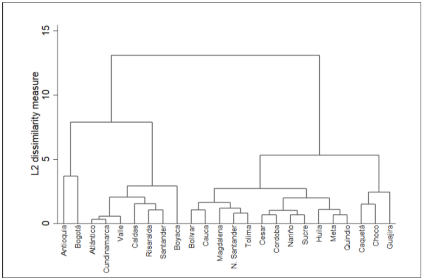 The dendrogram suggests four groups at a distance of less than 5 (see Figure Nº 3)14. The first cluster includes Bogotá and Antioquia, regions that show high and positive elasticities, especially in the services sector15, as well as the highest levels of competitiveness, especially in terms of innovation and sophistication.