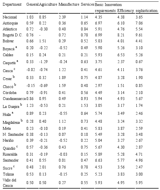 Competitiveness appears to be negatively associated with informality and unemployment but positively related to high elasticities in agriculture, sector that represents the majority of the non-oil Colombian exports. High elasticities in manufacturing and services are accompanied by higher levels of economic growth. However, according to these results, economic growth does not necessarily mean to be competitive, and viceversa. The majority of the departments show negative elasticities in agriculture, while all elasticities in services are positive. The cluster analysis generates four groups, with the most competitive departments showing positive elasticities, larger in services. Even though there is no clear indication of how competitiveness and elasticities relate to each other, the clusters based on competitiveness, on elasticities, or both show similar results.
