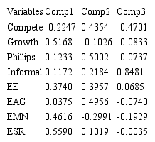 The second stage of the PCA indicates a separation between elasticities in the agricultural sector (EAG) from those in the manufacturing (EMN) and services (ESR) sectors. The first of the three components obtained explains 34.28% of the total variability. According to this component, high elasticities in the secondary and the tertiary sectors imply economic growth but not necessarily competitiveness. The second component (23.84%) associates high elasticities in the agricultural sector with competitive capacity, but also with inflation, commonly observed among agricultural product. Once again, high elasticities at the agricultural sector and competitive capacity are opposed to high employment elasticity in manufacturing (see Table Nª 3).