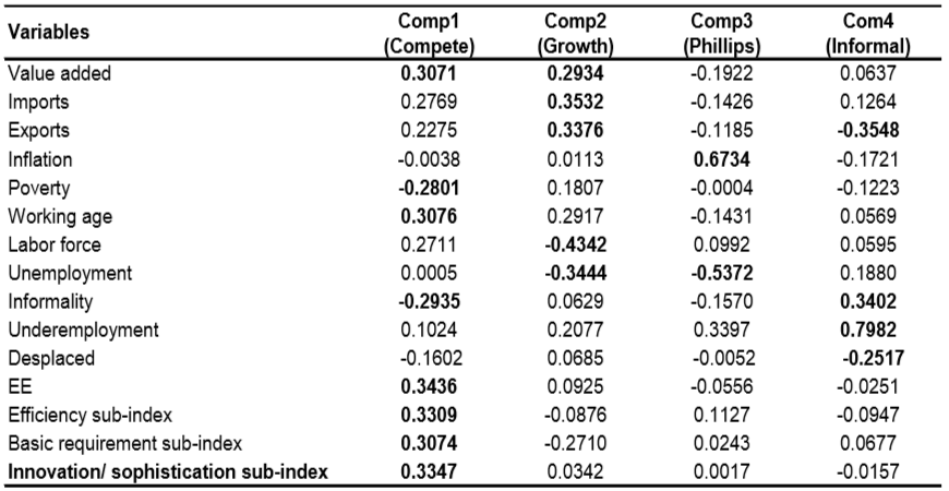The first stage of the unrotated PCA on macroeconomic variables generates four factors or components that can be described as follows. The first is a component of competitiveness explains 57.99% of the total variability of the variables and is named COMPETE, since added value, DCI and its sub-indexes are strongly opposed to poverty and informality, meaning that high levels of competitiveness are associated to high levels of added value and low levels of these two problems. The second component explains 12.39% of the total variability and opposes added value and international trade variables to labor market indicators such as unemployment rate and labor force, reason why it can be considered a component of economic growth and is given the name of GROWTH. The third is a Phillips curve component that explains 9.59% and opposes inflation to unemployment, therefore receiving that same name. Finally, the last component has an explanatory capacity of 7.07% and opposes informality, inadequate employment, and the displaced to exports, so that it reflects the capacity of the economy to absorb the labor force, and is given is named INFORMAL(see Table Nª 2).