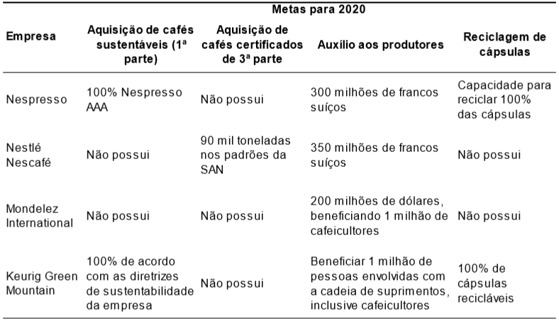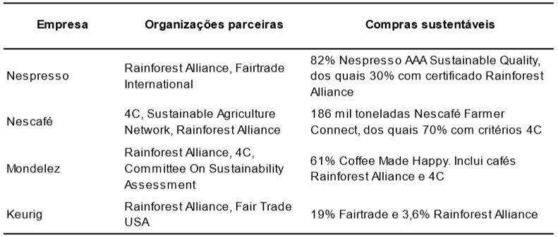 Das quatro companhias analisadas, Nespresso e Keurig estabeleceram metas de adquirir 100% de café sustentável até 2020, incluindo certificações de 1ª, 2ª e 3ª partes. Ambas já compram volumes expressivos de cafés com certificação de 3ª parte, mas não estabeleceram metas de longo prazo para esta categoria específica. As outras duas (Mondelez e Nescafé), por ocasião da publicação dos relatórios mais recentes, estavam em busca do cumprimento das metas estabelecidas para 2015, mas a Nescafé planeja adquirir 90 mil toneladas de café com critérios da SAN até 2020. A Tabela Nº 1 apresenta as organizações de promoção da sustentabilidade na cafeicultura que trabalham com cada empresa e os dados de compras de cafés sustentáveis informados pelas empresas para o ano fiscal de 2014.