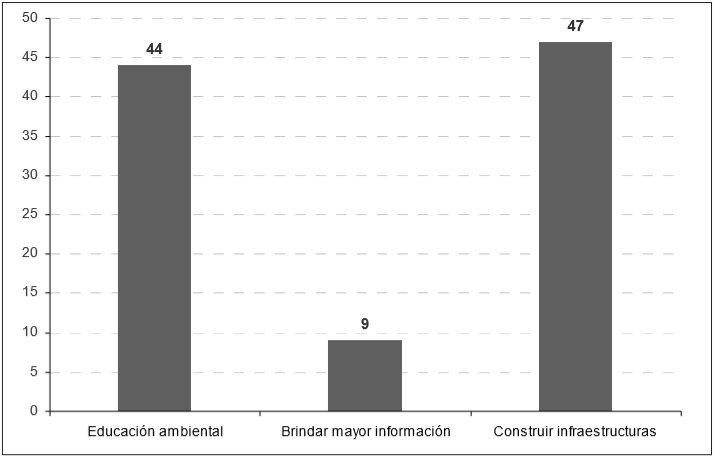 Respecto a la percepción social sobre las políticas públicas para controlar la sequía, el 47% de los encuestados señaló que los gobiernos locales deben orientar sus políticas públicas hacia la construcción de infraestructuras de almacenamiento, conducción y distribución de agua. Por su parte, el 44% resaltó que es necesario emprender procesos de educacion ambiental a la población para mejorar el grado de concientización en el cuidado del agua y conservación de páramos, mientras el resto (9%) indicó que es importante que los Gobiernos locales brinden información oportuna sobre el clima en la provincia del Carchi (Figura Nª 4).