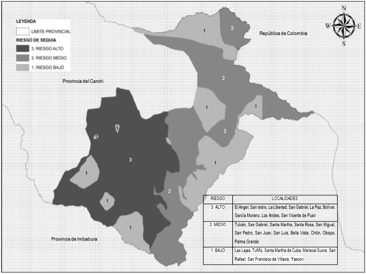 El agua es un recurso cuya disponibilidad se reduce día a día. En el caso de la provincia del Carchi son las sequías los eventos climáticos que tienen consecuencias catastróficas. Así, por ejemplo, en el año 2009 el déficit hídrico de la provincia del Carchi dejó pérdidas muy grandes en la agricultura y en la ganadería, lo cual impulsó al Gobierno Nacional a decretar estado de emergencia para enfrentar tal situación A pesar de este decreto y de las acciones implicadas en el mismo, se registraron 2.000 damnificados y extensas áreas de cultivo afectadas por la sequía. En efecto, según el Ministerio de Agricultura, Ganadería, Acuacultura y Pesca hubo 4.500 agricultores afectados; 40.000 hectáreas de sembradíos perjudicadas; 8.000 hectáreas perdidas; 120 mil cabezas de ganado en riesgo y 1.714.500,00 dólares estadounidenses (USD) en pérdidas (SNGR, 2010).