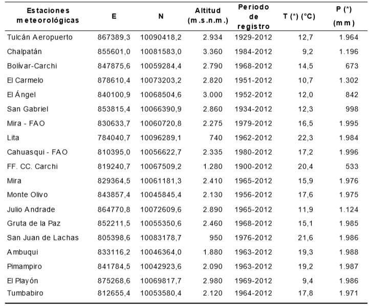 En el Cuadro Nº 1 se indican los datos de pluviosidad media anual (P, en mm); temperatura media anual (T, en ºC); altitud (en m.s.n.m.); período de registro (años) y coordenadas UTM. Las mismas corresponden a las 19 estaciones meteorológicas que forma parte de la base de datos del Instituto Nacional de Meteorología e Hidrología (INAMHI, 2012), localizadas en el área de estudio, dentro de la provincia del Carchi.