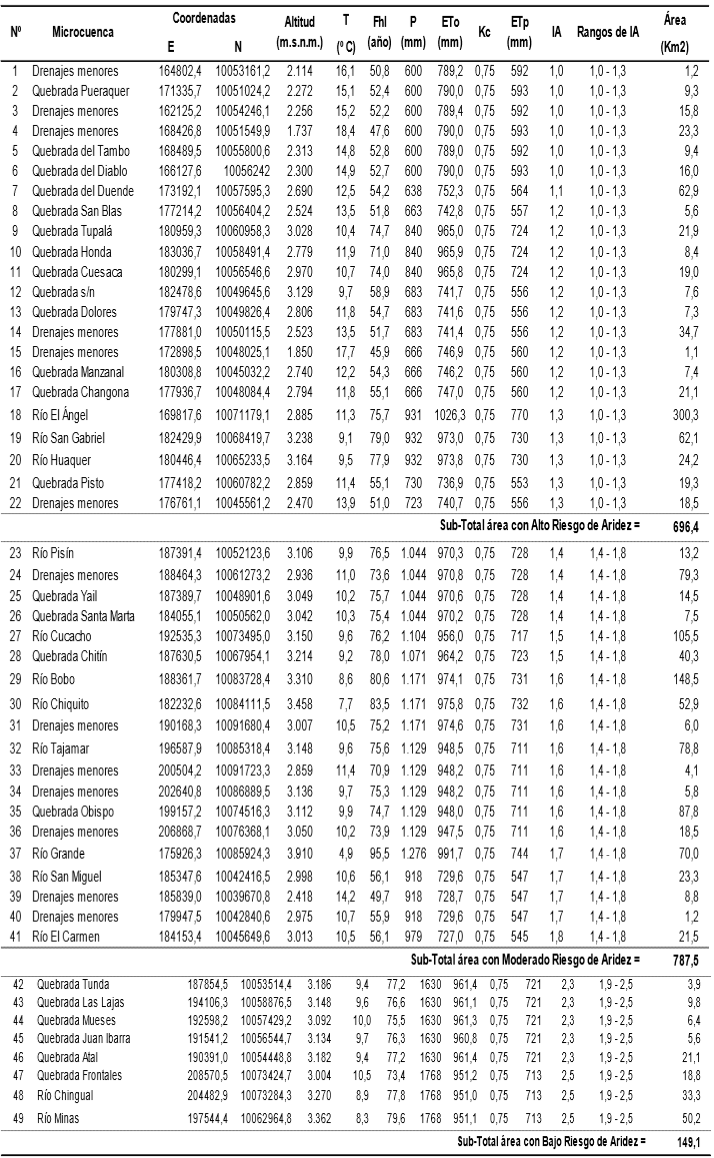 En el Cuadro Nª 2 se presentan los valores del IA obtenidos a partir de la Ecuación Nª 3. Con base en los rangos del IA indicados, fue posible establecer las tendencias de la aridez en el área de estudio. Los resultados revelaron que las microcuencas que tienen un IA entre 1,0 y 1,3, con una superficie 696,4 km2, exhiben la mayor tendencia de aridez; por su parte, las microcuencas donde la tendencia a la aridez es moderada (IA entre 1,4 y 1,8) llegan a cubrir una superficie de 787,5 km2; además, las microcuencas donde la tendencia es mínima (IA entre 1,9 y 2,5), tienen una superficie de 149,1 km2.
