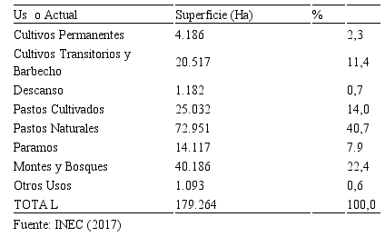 En la provincia del Carchi el 41% de las tierras están destinadas a pastos naturales, 22% a montes y bosques, 14% a pastos cultivados y 11% para cultivos transitorios y barbecho (Cuadro Nª 3). La mayor cantidad de territorio está cubierto de pasto natural y bosques, usos que no se encuentran ubicados en el territorio vulnerable a sequías, a diferencia de los pastos cultivados (14%) y cultivos transitorios y barbecho (11,4%), que están ubicados en áreas vulnerables a la sequía; lo cual significa que el 25% de la provincia está dedicado a la producción agropecuaria sujeto a problemas de sequía.
