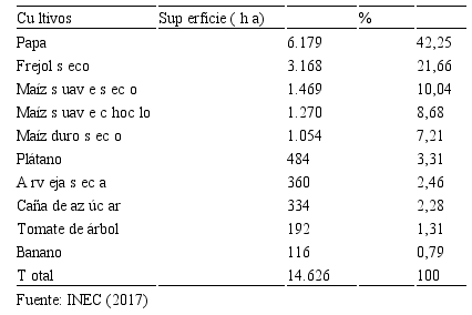 La legislación actual determina que una competencia directa de los gobiernos provinciales es el desarrollo productivo de sus territorios. En tal sentido, el Gobierno Provincial del Carchi ha priorizado cadenas productivas de las principales actividades en las que centra los esfuerzos sus habitantes. El principal cultivo de la zona es la papa, con el 42% de cobertura principalmente en los cantones Tulcán, Montufar, Huaca y Bolívar; luego se ubica el cultivo de frejol, con 21,66%, concentrado principalmente en los Cantones Mira y Bolívar; le siguen el maíz suave seco, el maíz para choclo y el maíz duro, que entre los 3 suman un total de 25% (tal como se observa en el Cuadro Nª 4). En consecuencia, estos cultivos son los más afectados al momento de ocurrir sequías prolongadas.