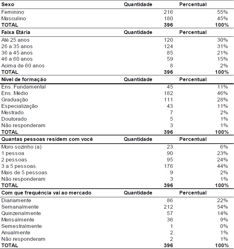 Em relação ao perfil da amostra, do total de 396 pessoas que responderam ao questionário 55% são mulheres e 45% homens. Sobre a idade a maioria, que totalizou 124, se encontrava na faixa etária dos 26 aos 35 anos representando um percentual de 31%, em relação à escolaridade, a maioria dos respondentes possui no mínimo o Ensino Médio completo, totalizando 182 pessoas que representam 46% da amostra. Outra informação obtida definiu que a maioria dos respondentes convive em lares com 4 a 5 pessoas e 54% das pessoas entrevistadas frequentam o supermercado toda semana. Destes, a quantidade comprada de peixe, em média, é de 2 kg.