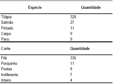 Os dados da pesquisa confirmam que a espécie de peixe de preferência e mais consumida pelos respondentes foi a Tilápia, a qual apareceu na pesquisa por 328 vezes, sendo seguida pelo Salmão que foi mencionado 27 vezes, juntamente de outras 24 espécies de peixe, as quais juntas representam 26,46% do total, contra 73,54% da espécie majoritária, a Tilápia. Em relação ao corte o mais mencionado foi o filé com 336 pessoas que dizem ser seu corte de preferência. Os dados estão detalhados na Tabela Nº 2.