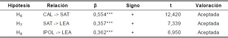 Para establecer la significatividad de los coeficientes path (.) en la fase de contrastación de hipótesis (Tabla Nº 10) se utilizó la técnica Bootstrapping con el estadístico . de una sola cola (con .-1 g.l., donde . es igual 5000 submuestras), debido a que se especificó previamente la dirección de la relación entre los constructos (Kock, 2015). De manera global se observa que todos los coeficientes . estandarizados superan el umbral de 0,30, lo cual indica que existen relaciones fuertes entre las variables (Chin, 1998a). Se acepta la hipótesis H., confirmando que CAL tiene una influencia positiva sobre SAT (H.: . = 0,554, . < 0,001). Esta es la relación más importante por su mayor coeficiente beta estandarizado. Asimismo, la aceptación de H. implica que SAT tiene una influencia positiva sobre LEA (H.: . = 0,357, . < 0,001). Finalmente, se evidencia que IPOL tiene una influencia positiva y significativa sobre LEA (H.: . = 0,362, . < 0,001). Esta hipótesis (H.) es aceptada por tener apoyo empírico.