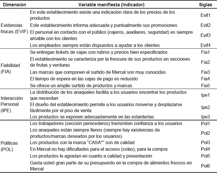 Para la presente investigación se adaptó la escala Calsuper, la cual originalmente fue pensada para clientes de negocios de capital privado. No obstante, la misma se utilizó como referente porque la literatura especializada no reporta el desarrollo de escalas para medir la calidad de supermercados de propiedad estatal. Por ello se tomaron todas las dimensiones de la escala Calsuper (Tabla Nº 2), las cuales sirvieron de sustento para proponer seis hipótesis relacionadas con la calidad percibida, a saber: