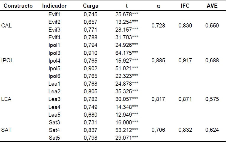 Aunque se ha propuesto un valor mínimo de 0,70 de aceptación de cargas de ítems o path loading (Henseler, Ringle & Sinkovics, 2009; Rela, Awang, Ramli, Taufik, Sum & Muhammad, 2020), otros autores han fijado un umbral más bajo de 0,6 (Urbach & Ahlemann, 2010; Latan & Ramli, 2013). Esto sirvió en una primera fase como base para descartar ítems inapropiados y, en caso de que la dimensión a la cual pertenecían no alcanzara los valores apropiados de alfa de Cronbach de la varianza extraída media (Average Variance Extracted-AVE) o del índice de fiabilidad compuesta (IFC) del constructo, también se eliminó esa dimensión. Con este procedimiento se descartaron: i) las dimensiones FIA, IPE y POL del constructo CAL, por lo cual se desestimó el apoyo empírico para las hipótesis H., H., H. y H.; pero sí se sustentó H.; ii) los ítems Sat1, Sat2 y Sat6 al Sat9 del constructo SAT; iii) los ítems Ipol2 e Ipol7 de la variable latente IPOL; y, iv) los ítems Lea6 al Lea8 de la variable latente LEA. De esta manera se logró una adecuada medición de los constructos CAL (medida por la única dimensión EVIF), SAT, IPOL y LEA (Tabla Nº 5). Las cargas de los ítems retenidos estuvieron en un rango entre 0,657 (Evif2) y 0,910 (Ipol3), confirmando la validez individual del instrumento de medida utilizado. La significatividad de las cargas de los ítems, al emplear el método de bootstrapping con 5.000 submuestras, evidenció que todas son altamente significativas (. = 0,001).