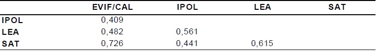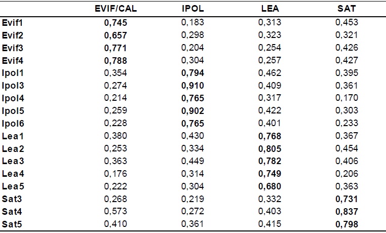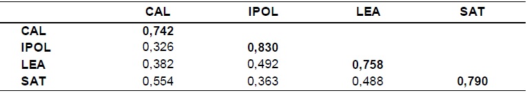 Se estimaron los coeficientes alfa de Cronbach (α) y el IFC del constructo, consideradas como medidas de consistencia interna. Para el IFC se aceptan valores superiores a 0,60 en investigaciones exploratorias (Höck & Ringle, 2010), iguales o mayores que 0,70 para propósitos confirmatorios (Henseler, Ringle & Sarstedt, 2012; Yanti, Agussalim & Sari, 2020). El coeficiente α se asume entre 0,70 y 0,90 (Campo-Arias & Oviedo, 2008; Abdul & Mamun, 2020), aunque se admiten valores ≥ 0,60 (Malhotra & Birks, 2007). Los valores del α variaron entre 0,706 (SAT) y 0,885 (IPOL) y los valores de los IFC oscilaron entre 0,830 (EVIF) y 0,917 (IPOL). Igualmente, el estadístico AVE confirmó la validez convergente y discriminante de los constructos (Garson, 2016; Hair, Risher, Sarstedt & Ringle, 2019), ya que resultó superior al valor mínimo de 0,5 (Höck & Ringle (2010).