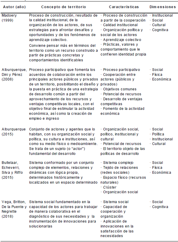 De las definiciones expuestas se observa que –en el marco de las políticas de desarrollo– el concepto de territorio ha evolucionado históricamente, trascendiendo de una visión netamente geográfica a una postura multidisciplinaria. Esta última abarca las dimensiones social, económica, institucional, política, cultural y ambiental, que forman parte del mismo (Tabla Nº 1).