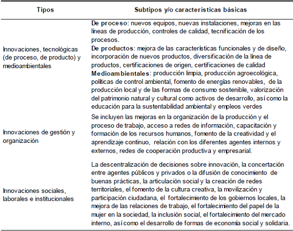 Dentro de la categoría de innovación productiva, Alburquerque (2015) señala que estas abarcan innovaciones tecnológicas, de producto, de proceso, medioambientales, así como las innovaciones de gestión, de organización y las de tipo social, laboral e institucional. En el Tabla Nº 2 se presentan algunos ejemplos de tales innovaciones.