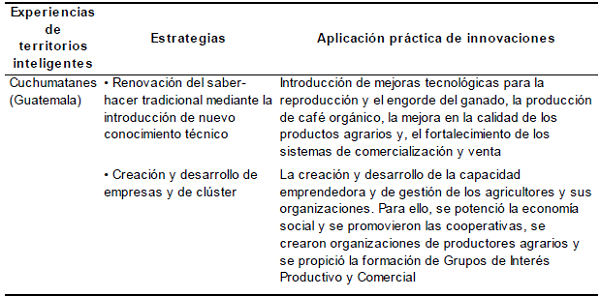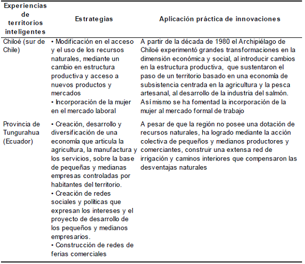 Concretamente al nivel rural se han registrado experiencias exitosas de territorios inteligentes. Ejemplo de ello son los casos de Tungurahua, en Ecuador; el Valle Sur-Ocongate y Jauja, en Perú, Chiloé, en Chile; Yucatán, en México; Cuchumatanes, en el oeste de Guatemala, Rafaela y Rosario, en Argentina; Villa El Salvador, al sur de Lima (Perú), entre otras (Vázquez, 2009; Berdegué et al., 2011).