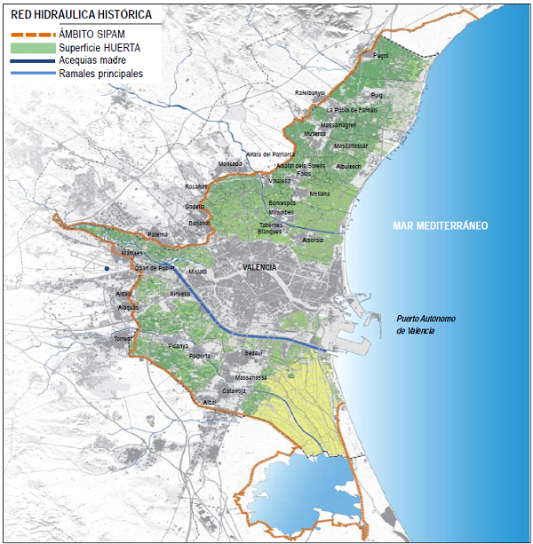 El regadío histórico de la Huerta de València es un área de cultivos en torno al río Turia regada por una red de canales de riego o acequias, originalmente diseñadas en la época medieval. Geográficamente, la zona regada abarca una llanura costera con una pendiente suave que disminuye lentamente desde el interior hacia el mar. El sitio abarca superficies agrícolas periurbanas que se extienden sobre un total de 17 km., de los cuales 12 km. se encuentran en la llamada “Horta Histórica” (de origen medieval) y 5 km. en el Parque Natural de la Albufera. De la superficie total, alrededor de 10 km. son los realmente dedicados al cultivo, con 8 km. en l’Horta Histórica y 2 km. en la zona arrocera del Parque Natural perteneciente a la ciudad de València. La delimitación geográfica de la red de riego del sitio SIPAM está representada en el Mapa Nº 1, con el lago al sur.
