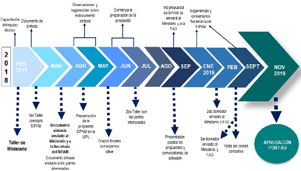 La preparación de la candidatura siguió un calendario de actividades que dio comienzo en febrero de 2018 con la participación en Madrid del equipo técnico en un Seminario impartido en el Ministerio de Agricultura, Pesca y Alimentación de España. Se iniciaba un proceso que queda detallado en el cronograma de la Figura Nº 1 y que requería el compromiso de la comunidad local, incluidos los agricultores, la academia, la sociedad civil y las instituciones. La formulación de la candidatura comenzó compartiendo la motivación por esta e identificando todos los grupos de interés cuya reacción fue muy positiva y colaboradora. La definición de un comité técnico que marcara las pautas y asegurara la alineación con la visión común, así como la designación de un líder de proyecto y de un equipo técnico que asumiera la responsabilidad de elaborar la propuesta formal del sitio SIPAM, fueron el punto de arranque de este proceso que duró año y medio.