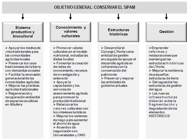 Teniendo en cuenta todos estos planes, la candidatura del sitio SIPAM de València, además de demostrar el cumplimiento de los criterios antes encunciados, precisaba definir un plan de acción específico dotado de un presupuesto para el sitio SIPAM propuesto. Esta herramienta se ha definido a través de un enfoque participativo y ha intentado priorizar acciones de acuerdo con los principales retos a los que se enfrenta el sitio.
