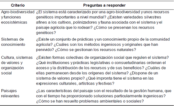 Según FAO (2019a) los sitios SIPAM propuestos deben demostrar su importancia mundial. Se trata de cumplir un conjunto de criterios que se incluyen en la Tabla Nº 1, que permiten reconocer el valor general de un sistema agrícola tradicional –plasmado en un sitio o localidad–, como patrimonio mundial. Su singularidad tiene un significado de “bien público” o sistema holístico, que se describe a través de una combinación de cinco criterios: i) seguridad alimentaria y de los medios de vida; ii) agro-biodiversidad y funciones ecosistémicas; iii) sistema de conocimiento; iv) cultura, sistemas de valores y organización social; y, v) paisajes relevantes.