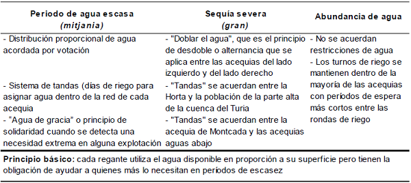 Las comunidades de las acequias se rigen por antiguas ordenanzas que fueron transmitidas directamente por los árabes y luego, una vez escritas, se conservaron hasta principios del siglo XVIII, momento en que lograron la ratificación por parte del rey Felipe V. Estas normas estipulan una distribución sencilla y realista de un caudal común. Pero al mismo tiempo imponen la autoridad necesaria en los momentos difíciles cuando, debido a la escasez de agua, el bien común se ve amenazado. Dentro de cada acequia, cuando hay suficiente agua, el riego se realiza por turnos. En tiempos de sequía, los síndicos o representantes de los regantes tienen la autoridad de distribuir el agua de acuerdo con criterios que permitan que los impactos sean equilibrados y que se han transmitido generación tras generación. Se trata de un legado histórico que se mantiene en la actualidad.