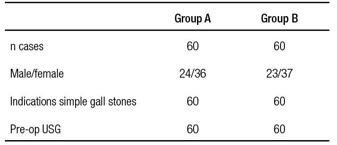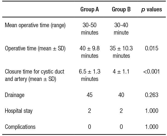 A total number of 120 patients selected randomly and divided into two groups A and B. Patients in whom cystic pedicle was ligated using suture were assigned group A (60 cases), and the one in whom ligaclips were used were named under group B (60 cases). In group A, there were 24 males and 36 females, whereas in group B there were 23 males and 37 females. Both groups had cholelithiasis and acute attack was excluded using history, clinical examination and pre-operative imaging. Patients in whom cystic pedicle was ligated using suture were assigned group A, and the one in whom ligaclips were used were named under group B. The mean operative time in group A was 30 - 50 minutes and in group B it was 30 - 40 minutes (p = 0.015). The time required for suture ligation was 6.5 ± 1.3 min and for ligaclips it was only 4 ± 1.1 min thus decreasing the overall operative time of the procedure (p > 0.001) which was significant. Drain was removed when the volume decreased to < 20 ml/24 hours and colour of the discharge becomes light serous. Only in three cases there was bile in the discharge which remains only for four days. The mean operative time less in whom cystic artery and duct was closed with titanium clips as compared to the silk ligature which was significant. There were no major differences seen in both groups in terms of inpatient stay, post-operative complications and safety of the procedure (Table 1 and 2).