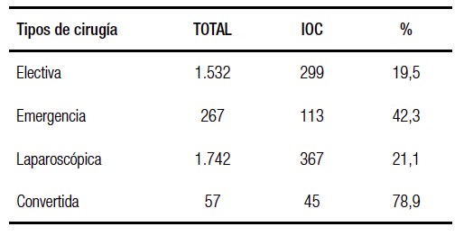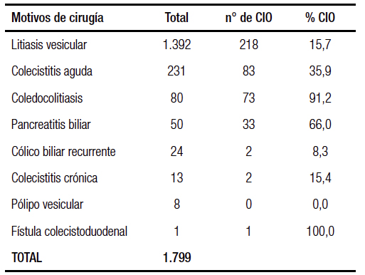 En las cirugías laparoscópicas se realiza CIO al 21% y en aquellas que fueron convertidas ese porcentaje aumenta a 78%, lo cual se comprende ya que las razones que llevan a modificar la técnica quirúrgica habitualmente son la gran inflamación y la dificultad en la disección por laparoscopia. En cirugías de urgencia: 42% de CIO y en programadas 19,5%; las causas de esa diferencia de porcentajes obedecen a que las urgencias suelen ser cuadros de colecistitis aguda (Tabla 4).