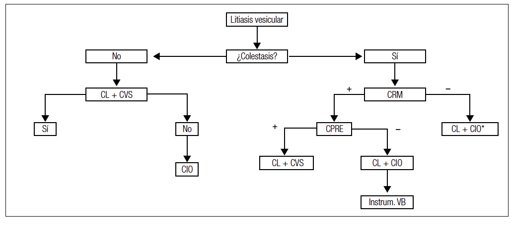 El manejo de la litiasis coledociana asociada a la colecistectomía laparoscópica y la realización de la CIO es un tema importante, pero no es motivo de análisis en este trabajo. El análisis retrospectivo con seguimiento a un año nos impide realizar la evaluación en un lapso adecuado para dar datos fidedignos sobre litiasis residual. La Figura 3 muestra el algoritmo diagnóstico y terapéutico utilizado por el servicio.22